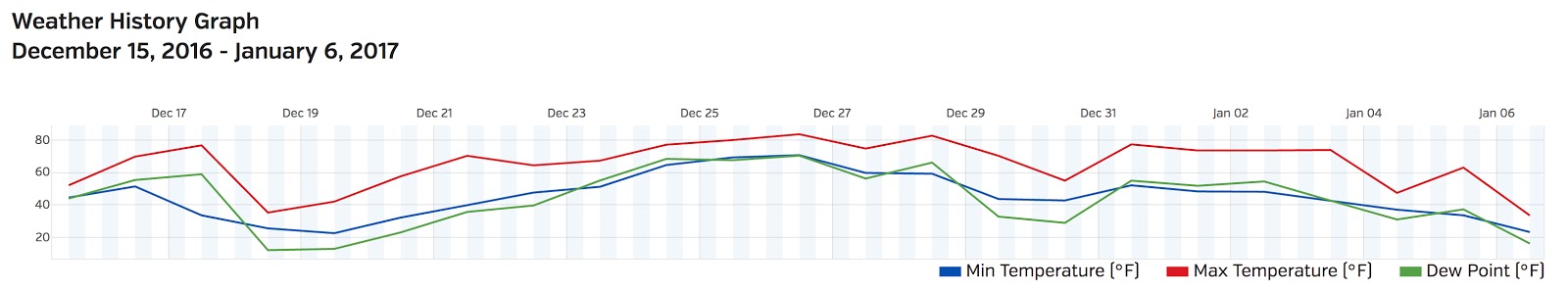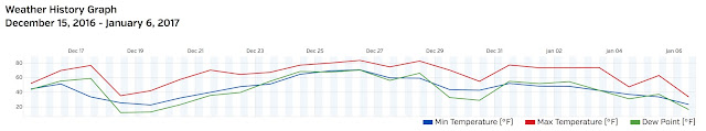 I have a record of the whole thing, because of the weather station I installed in my back yard (it's a long story, but the nub of my motivation is that we live in a kind of hyper-local rain shadow, so the Austin news stations' summaries of how much rain the area receives tell me nothing about whether I should turn the sprinkler system on or off). Here's the temperature graph for 15 December 2016 through 6 January 2017: